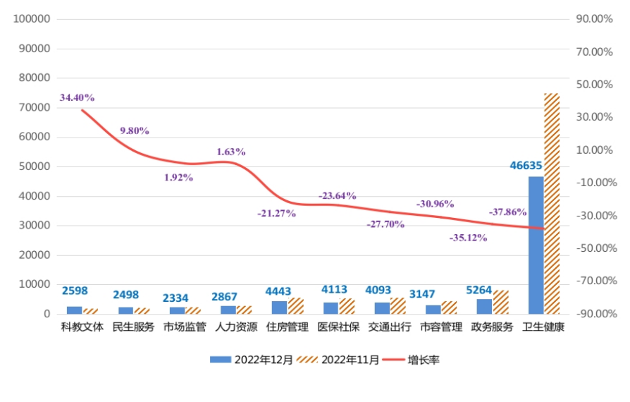 市民反映的问题集中在卫生健康(46635件)、政务服务(5264件)、住房管理(4443件)、医保社保(4113件)、交通出行(4093件)等10个方面。受疫情防控优化调整影响,卫生健康问题降幅37.86%。政务服务诉求量下降35.12%,主要为安康码